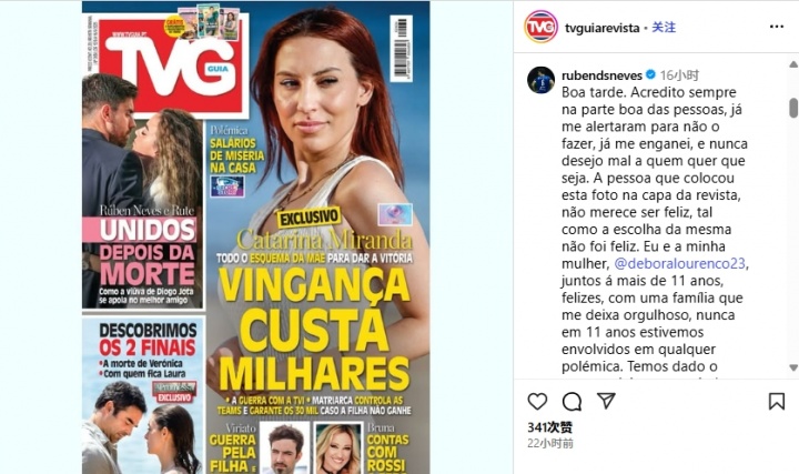 09月11日讯 昨日葡萄牙一家杂志发布封面,其中封面一部分是鲁本-内维斯和若塔妻子很亲密的一张照片。