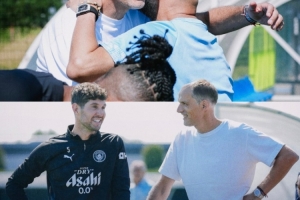 图赫尔今日参观曼城训练,球队官推晒图赫尔与瓜帅亲切拥抱照片