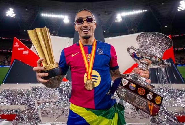 赛后,拉菲尼亚手捧西班牙超级杯冠军奖杯和比赛MVP奖杯庆祝。